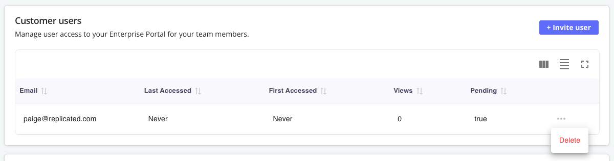 In the Customer users table, find the target customer and open the dot menu. Click Delete.